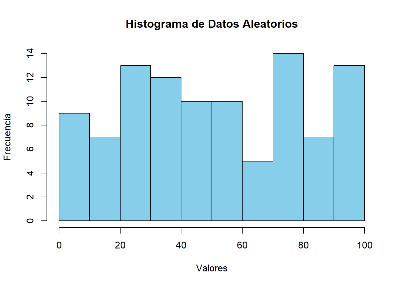 # 1. Generar un conjunto de datos aleatorios (100 números entre 1 y 100)datos <-sample(1:100, size =100, replace =TRUE)# 2. Calcular la media de los datosmedia_datos <-mean(datos)# 3. Calcular la desviación estándar de los datosdesviacion_estandar <-sd(datos)# 4. Crear un histograma para visualizar los datoshist(datos, main ="Histograma de Datos Aleatorios", col ="skyblue", xlab ="Valores", ylab ="Frecuencia")